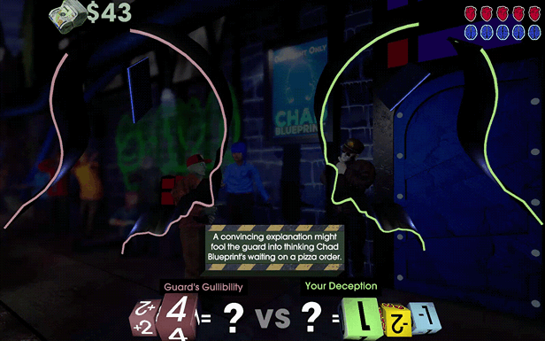 You show up to the club with seven skills: Athletics, Cooking, Deception, Music, Observation, Wisdom and Wit. These skills manifest as dice you'll be rolling throughout your mission. In Club Low, you upgrade your skills by upgrading individual faces of your dice, then roll 'em live with real-time dice physics.• A Reactive Narrative