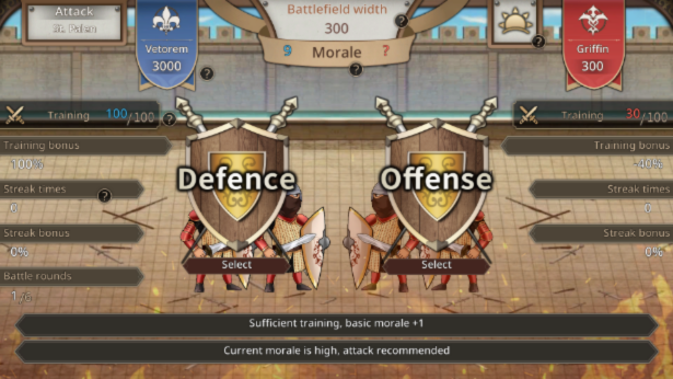 The game is a visual novel with strategic elements. Players take on the role of Norman's strongest legion commander and 'Attack' to recover territory, then 'Transfer' to defend territory. During the battle, 'Attack' or 'Defend' is decided with reference to 'Morale,” where the result of 'Morale' determines the victory or defeat of each battle round.