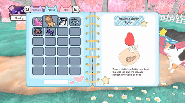 We wanted there to be no limits to how you could find happiness in Calico. Magic potions are a system that allow us to break the rules of what is possible and to find what would be most fun. Example: the More-to-pet Potion allows the player to magically turn a single animal giant-sized! You can hang out with a giant animal, or even ride a giant cat!