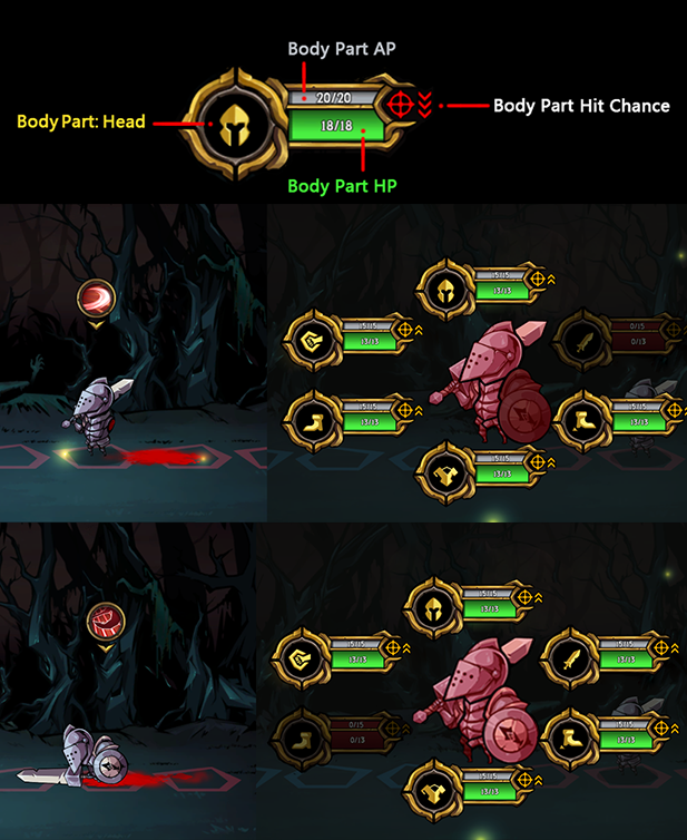 For example: If their limbs (i.e. arms or legs) are severed in battle, any skills that use the limb can no longer be used. And if an adventurer's armor is destroyed, they'll be left bare (each state with its own corresponding art assets).