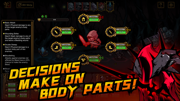 For example: If their limbs (i.e. arms or legs) are severed in battle, any skills that use the limb can no longer be used. And if an adventurer's armor is destroyed, they'll be left bare (each state with its own corresponding art assets).