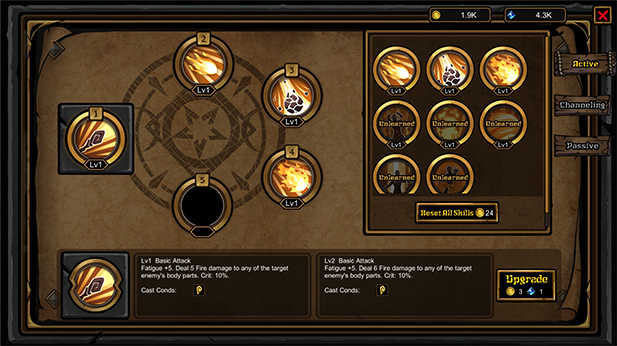 Characters have 20 levels and start with one set skill (at Lv.1). After leveling up, they have a chance to roll for a skill, selecting 1 from 3 possible skills as a reward. Each character has around 20 possible skills. After Lv.10, they can gain new skills through random events.