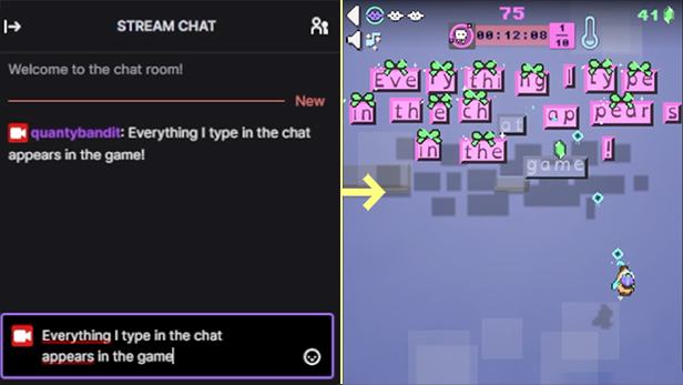 💪 The number of spectators and the intensity of the exchanges on the chat change the difficulty of the levels. High activity means more obstacles and enemies, but also more bonuses to collect!