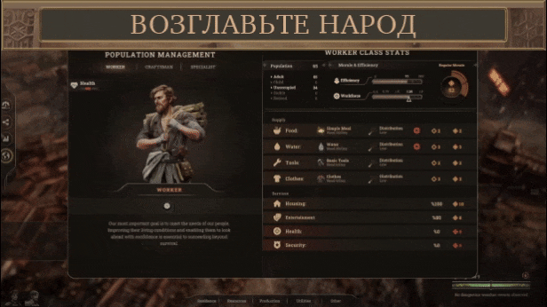 Заботьтесь об основных потребностях населения. Распределяйте еду, воду, инструменты и одежду и управляйте графиком работы. Наполняйте жизнь развлечениями и открывайте медицинские службы для заботы о здоровье жителей и предотвращения болезней. Каждый новый член сообщества приближает вас к открытию забытых технологий старого мира.
