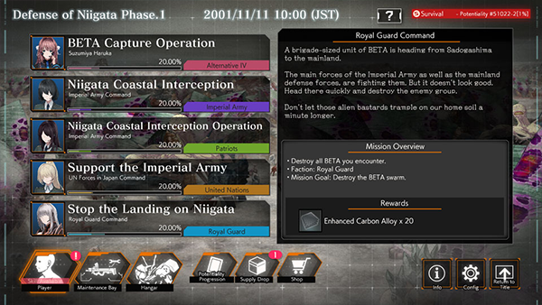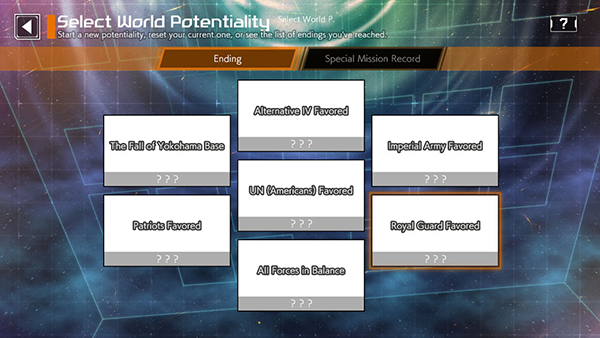 This mode has eight separate endings depending on the power balance between the different factions, the mission success rate, and the state of the BETA invasion.