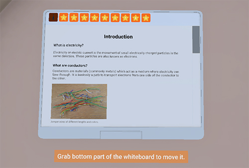 Get information about circuit components values (voltage, current, voltage drop, resistance, …) when hovering over them with the controller. Easily detect errors in your circuit as you’ll get a warning when doing something wrong (short circuit, open circuit, too much current, …).
