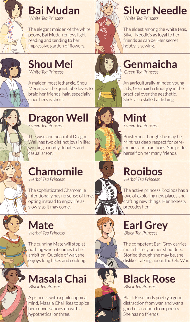 Before the Old War, there lived two factions: the Tea Princesses and the Coffee Regents. The Tea Princesses chose to rule their realms separately, allowing each princess to govern by her own virtue... but the Coffee Regents chose to unify their lands, forming the great and terrible Coffee Empire. The most eminent regent, the Coffee Emperor, rose mighty armies and waged blind conquest across the continent. Their domains now splintered and on the brink, the Tea Princesses must embark on a quest to reclaim their homelands...