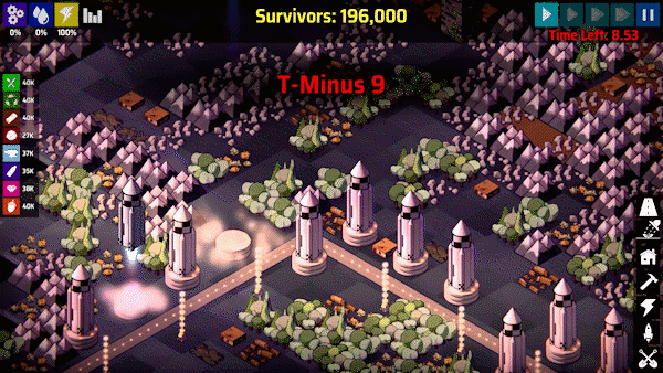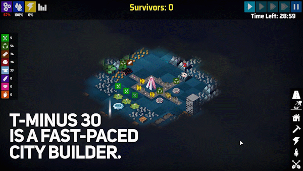 T-Minus 30 is a fast-paced, single-player city builder where you plan a city and assemble a space fleet to escape a dying Earth.